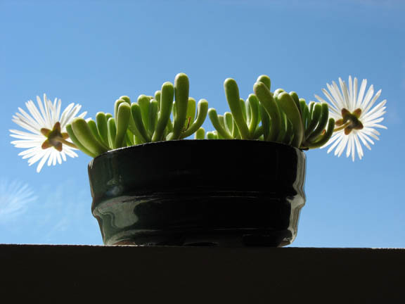 The sun rises and sets while it faces the window, blinking just once with both flowers.