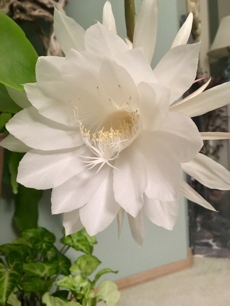 And now for something completely different—a salad plate-sized flower from the cactus, Epiphyllum oxypetalum, or Queen of the Night. Taking weeks for the immature flower to grow, the bloom opens for only one night once it’s ready, then slowly closes and fades by sunrise like the memory of a marvelous dream.