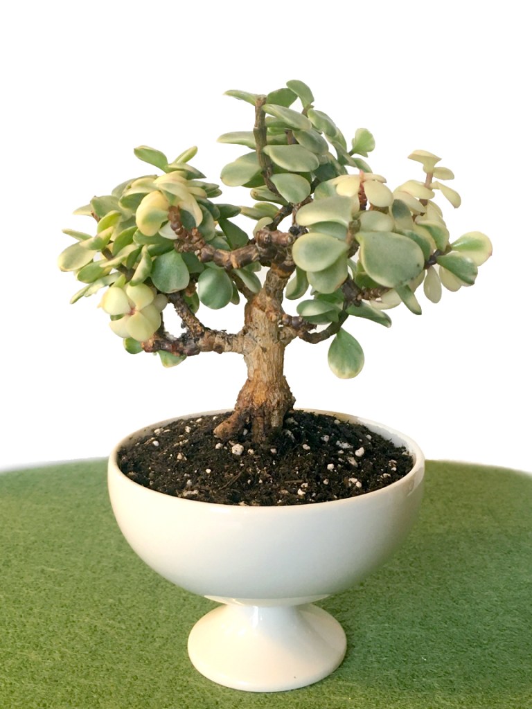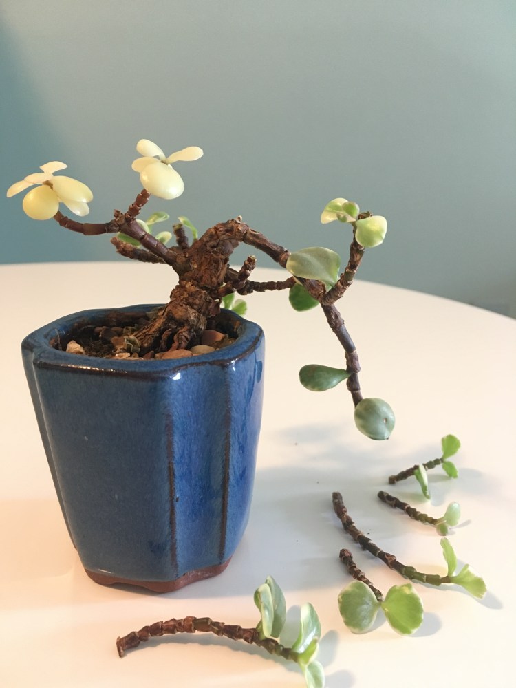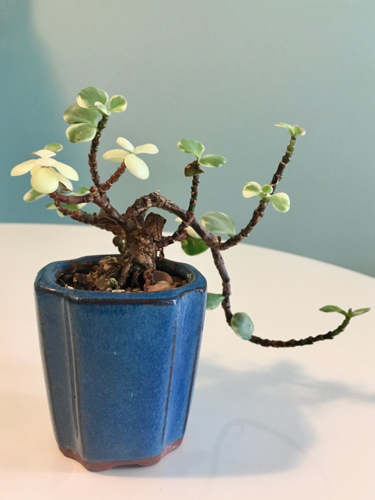 At twenty years old, this 4″ tall Rainbow Elephant Bush (Portulacaria afra variegata) is a baby with some history. Ten years in sunny Santa Fe, then another ten in the sun-challenged Seattle area, it’s grown a bit yellow from supplemental LED Grow Lights over the darker months.